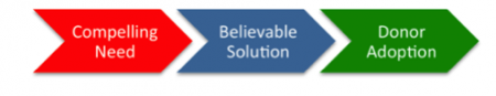 You have probably seen this happen in major gifts—where the program people or the CEO, president or executive director has come up with this really cool idea that no one wants or needs. It happens more than you know. And this is where the insiders are self-expressing vs. really being market-driven. So, this second point is also key. In order for the donor to adopt and support a solution, there must be compelling need and a believable solution. Here is how these three things work together (Image below).
