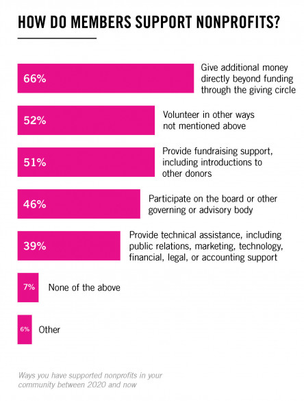 Members most frequently reported giving money to nonprofits outside of their giving circle donations (66%). They also reported volunteering their time and talents in the following ways: