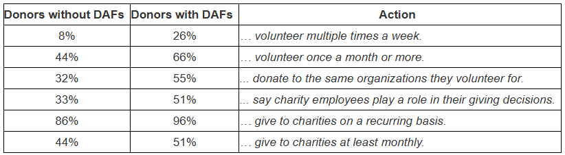 Among DAF donors in particular, research shows that two-thirds (66%) volunteer at least once a month, compared with 44% of donors without DAFs. The majority (77%) say they give more after opening a DAF, and one in five (19%) say they volunteer more after opening a DAF.