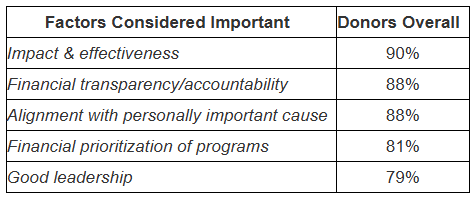 When deciding how and where to direct their giving, donors conduct thorough research through the charity’s website, review of its mission and accomplishments, and review of financial performance. During research, donors report impact, financial transparency, and mission alignment are extremely and considerably important.