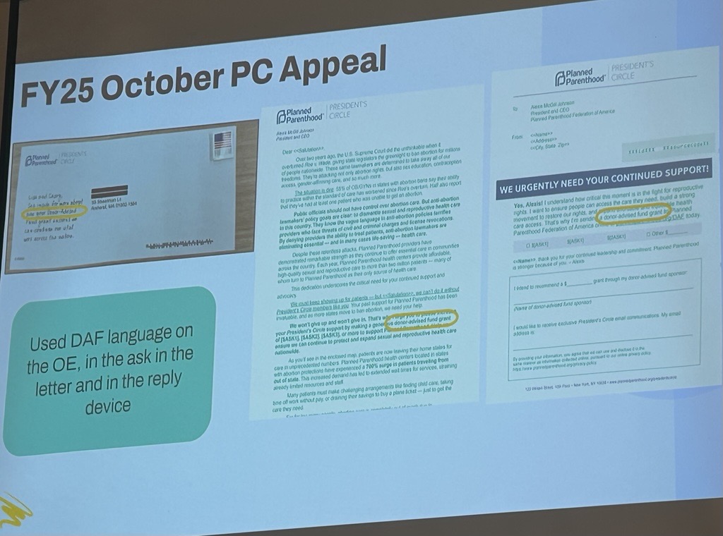 A slide showing the direct mail campaign Planned Parenthood sent to mid-level donors with donor-advised funds. Circled in yellow are the callouts about DAFs. Click to enlarge.