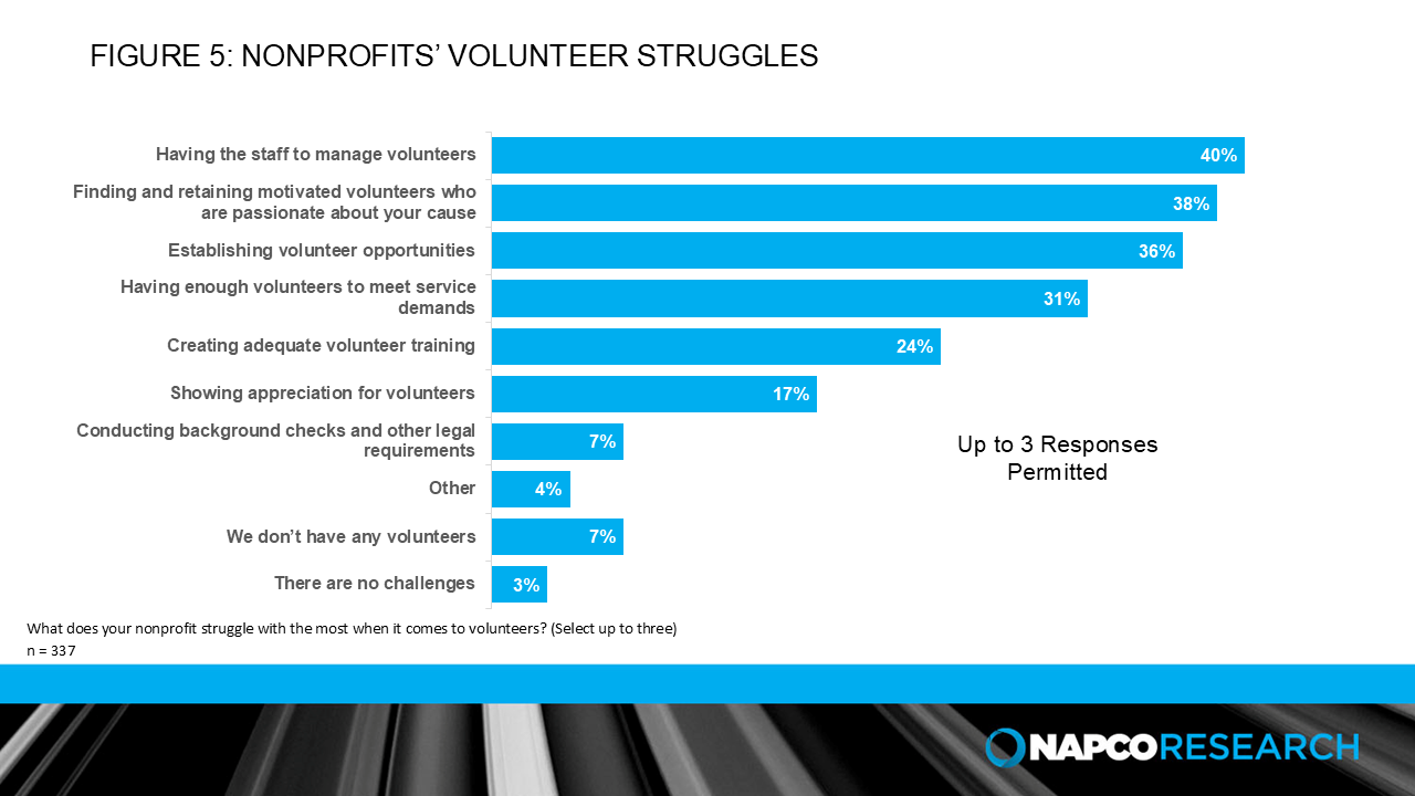 When asked about volunteer-related challenges, 40% of nonprofit leaders cited having the staff capacity to manage volunteers as an obstacle, making it the overall top challenge in this area. Midsize nonprofits in particular reported this as their biggest volunteer-related issue.