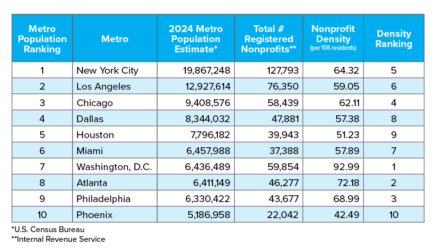 The New York City metro area has more registered nonprofits than any other metro area in the nation. That statistic is not surprising. What is surprising is that among the top 10 largest metro areas, New York ranks fifth in organizational density. The Washington, D.C., metro area has the highest concentration of organizations per 10,000 residents — 30% greater than New York City.